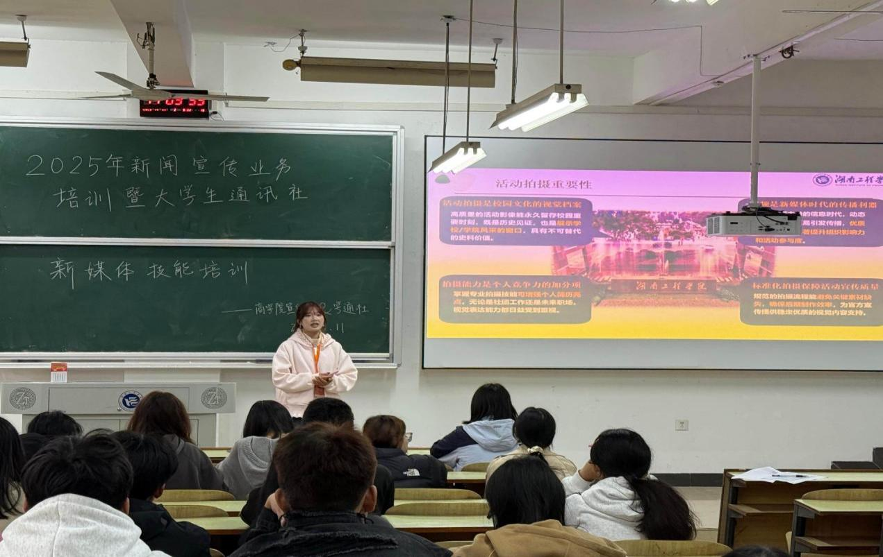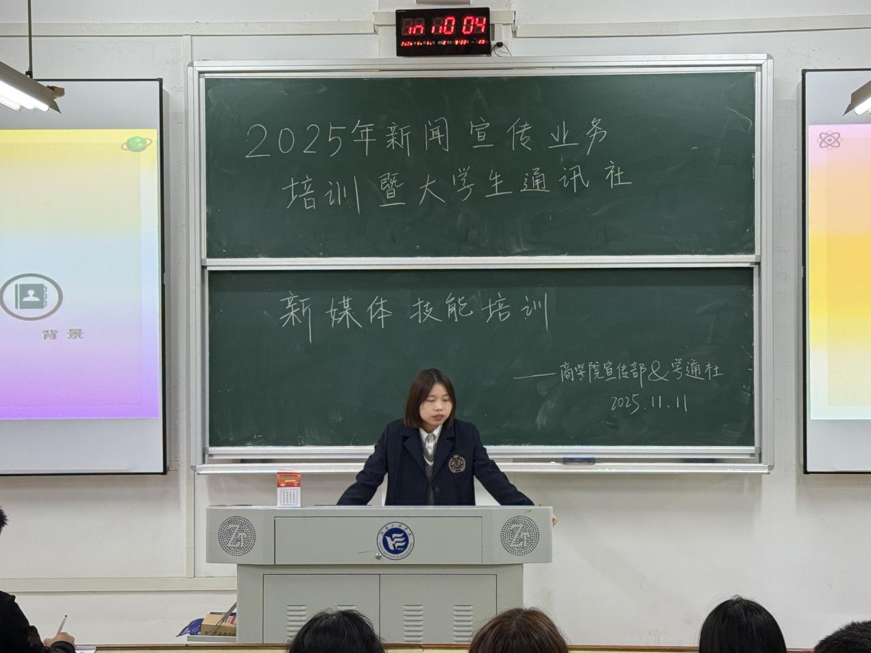 11月11日下午,商学院在主校区D202教室举办新闻宣传业务培训会。培训邀请湖南工程学院党委宣传部杨欢老师、学通社策划中心副社长赵兴圆同学分别讲授新闻写作要领与新媒体拍摄表达技巧,商学院学生联合组织各部门学生干部干事参加培训。旨在提升同学们的宣传业务能力与新媒体技能。